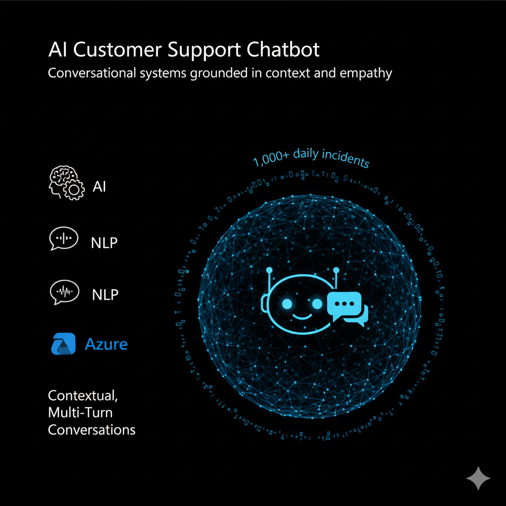 An AI assistant on Azure with custom NLP pipelines that handles 1,000+ daily incidents through contextual, multi-turn conversations.
